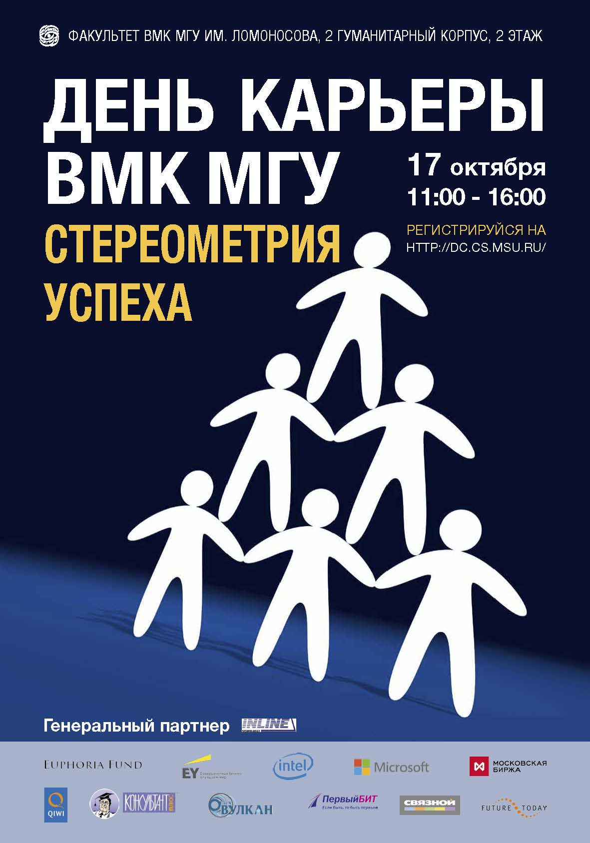 Приглашаем вас принять участие в традиционном Дне Карьеры ВМК МГУ, который состоится 17 октября 2014 года. Мероприятие будет проходить с 10:00 до 16:00 в северном холле 2 этажа 2-го учебного корпуса.
