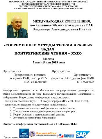 Московский государственный университет имени М.В.Ломоносова, факультет ВМК совместно с Воронежским государственным университетом, Математическим институтом имени В.А.Стеклова РАН и Вычислительным центром им. А.А.Дородницына РАН проводят Международную научную конференцию, посвященную 90-летию академика РАН Владимира Александровича Ильина «Современные методы краевых задач. Понтрягинские чтения – XXIX».