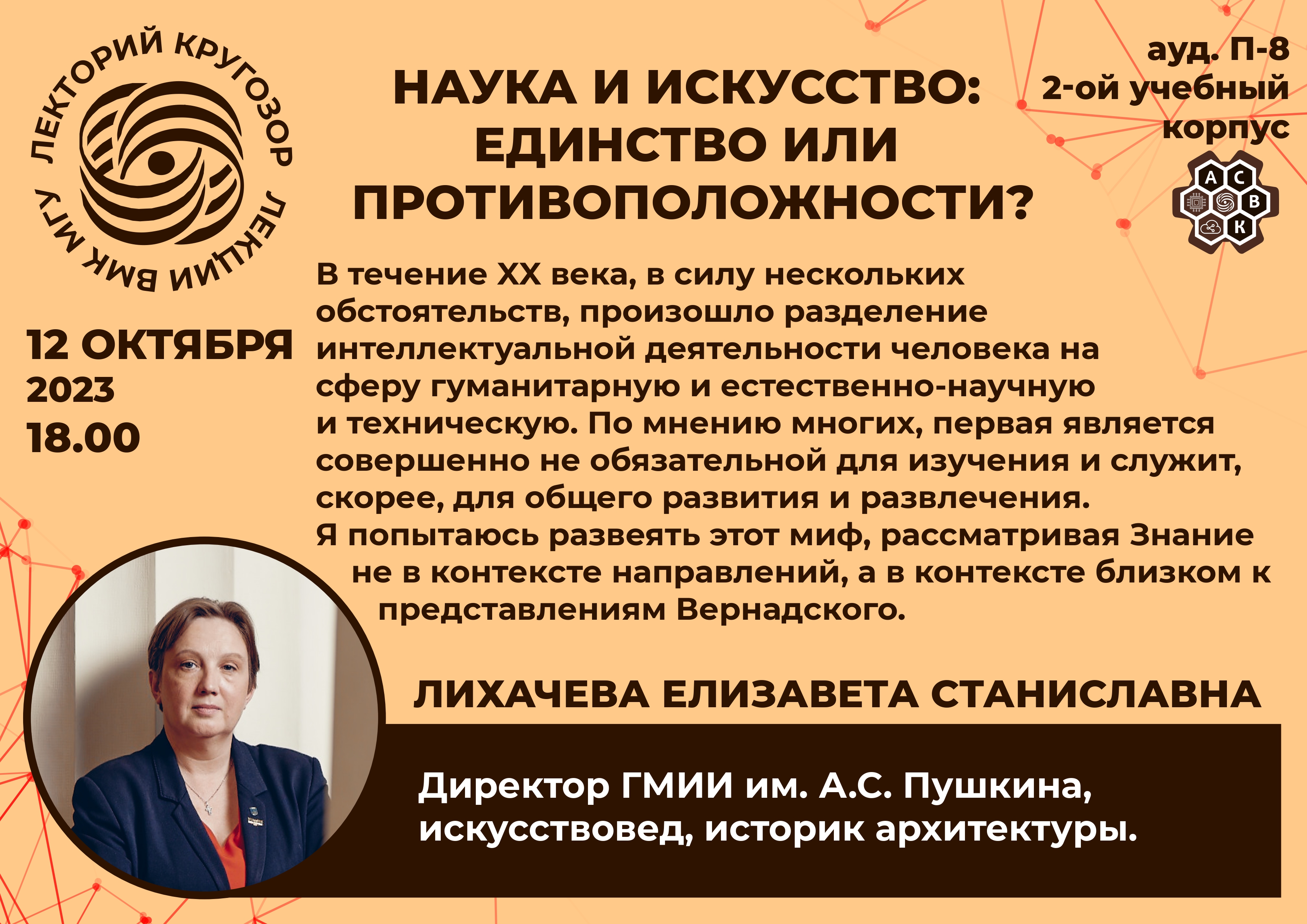 Лекция «Наука и искусство: единство или противоположности?» состоится 12 октября 2023 г. в 18:00 в ауд. П-8 во втором учебном корпусе.