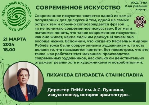Лекция «Современное искусство» состоится 21 марта 2024 г. в 18:00 в ауд. П-8а во втором учебном корпусе.