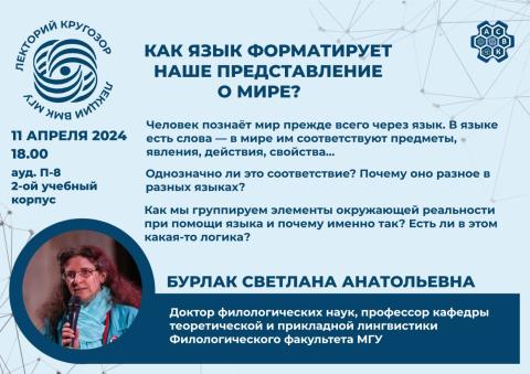 Лекция «Как язык форматирует наше представление о мире?» состоится 11 апреля 2024 г. в 18:00 в ауд. П-8 во втором учебном корпусе.