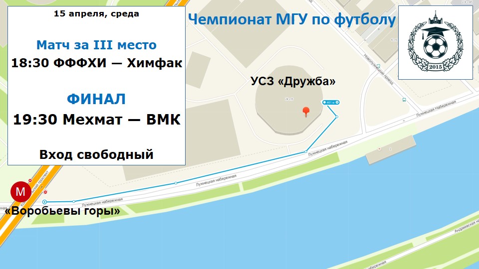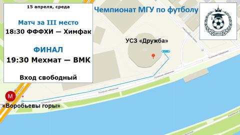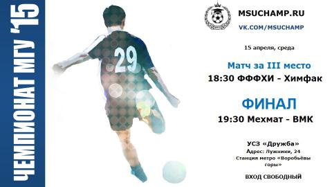 15 апреля 2015 года в УСЗ «Дружба» в финале сильнейшего выявят математики: команда факультета вычислительной математики и кибернетики выйдет на поле против команды механико-математического факультета.