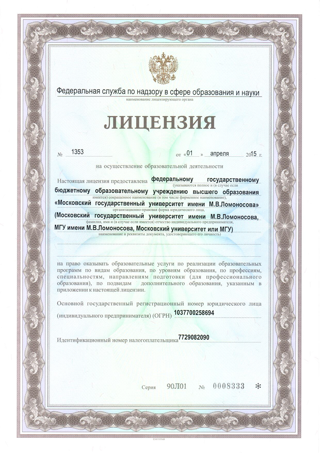 Ссылка на страницу с лицензией на право ведения образовательной деятельности на официальном сайте МГУ: http://www.msu.ru/study/lic/.