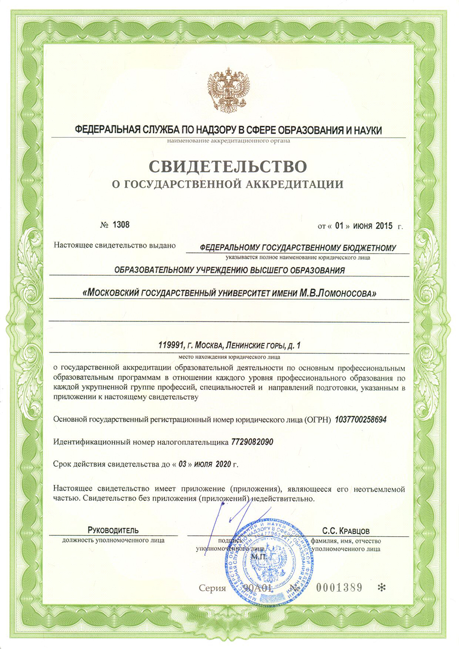 Ссылка на страницу со свидетельством о государственной аккредитации на официальном сайте МГУ: http://www.msu.ru/study/lic/akkredit/sv.html.