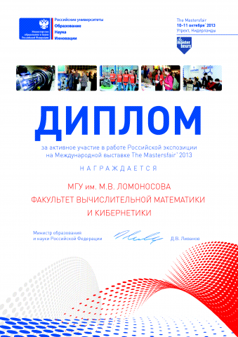 За активное участие в работе Российской экспозиции на выставке THE MASTERSFAIR - 2013 факультет ВМК МГУ удостоен Диплома Министерства образования и науки РФ.