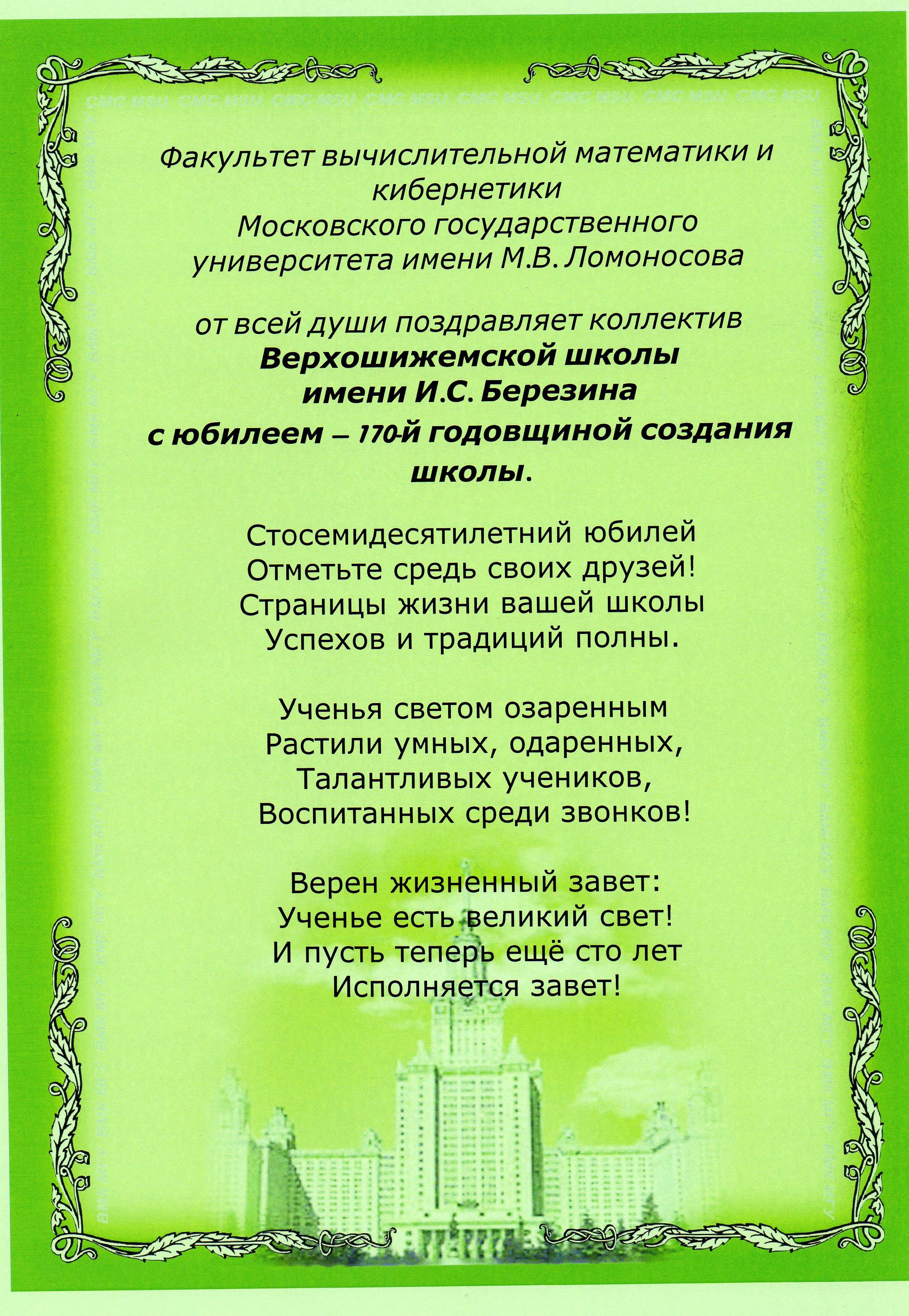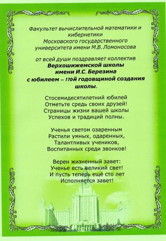 Факультет вычислительной математики и кибернетики Московского государственного университета имени М.В. Ломоносова от всей души поздравляет коллектив Верхошижемской школы имени И.С. Березина с юбилеем — 170-й годовщиной создания школы.