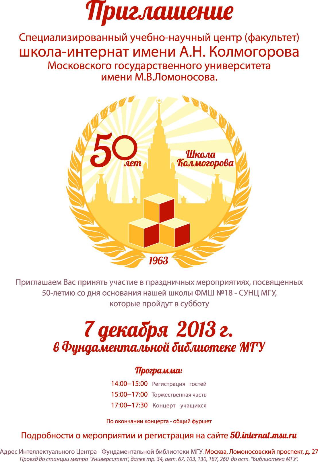 7 декабря 2013 года в Фундаментальной библиотеке МГУ пройдут праздничные мероприятия, посвященные 50-летию со дня основания школы ФМШ №18 — СУНЦ МГУ.