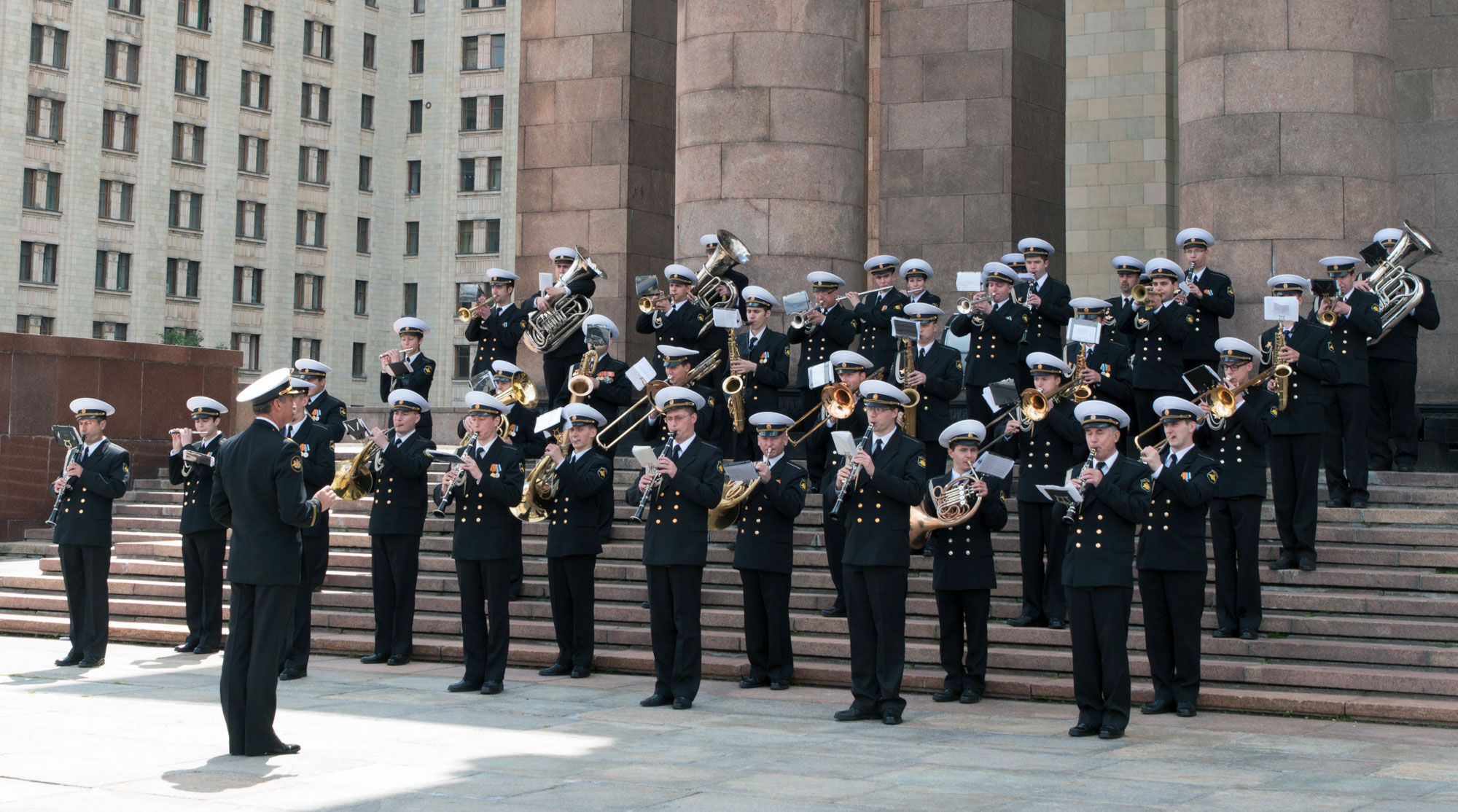 Завершился торжественный день традиционной фотосессией выпускников на лестнице главного входа под аккомпанемент Центрального концертного образцового оркестра имени Н.А.Римского-Корсакова Военно-морского флота России.