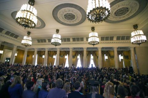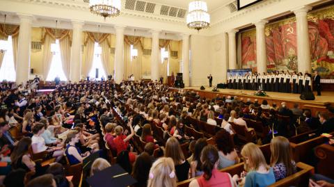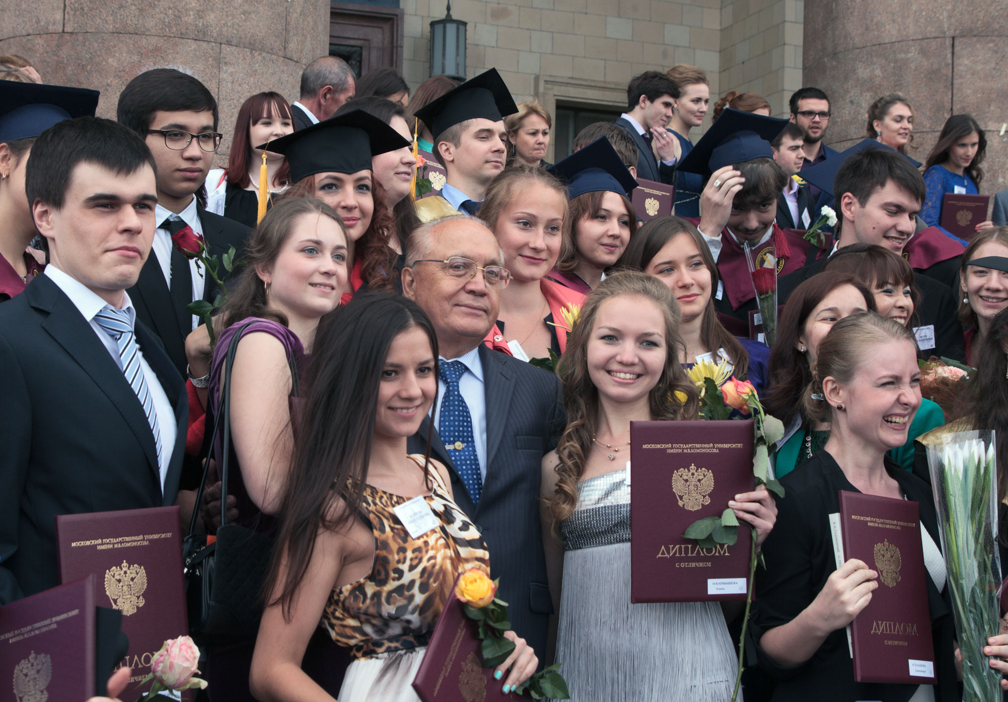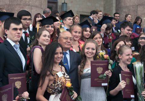 26 июня в актовом зале Главного здания МГУ состоялась церемония вручения красных дипломов. Традиционно МГУ выпускает 1600 студентов-отличников, что составляет около 25% от общего количества выпуска. Диплом в отличием получили 54 выпускника факультета вычислительной математики и кибернетики (из 304 закончивших в этом году).