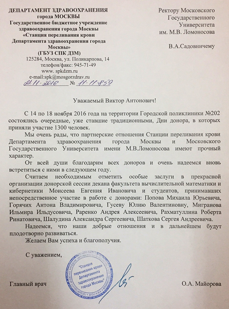 Главный врач Станции переливания крови Департамента здравоохранения города Москвы О.А. Майорова направила благодарность в адрес ректора академика В.А. Садовничего за проведенную 14−18 ноября 2016 года донорскую сессию, приуроченную ко Дню донора.