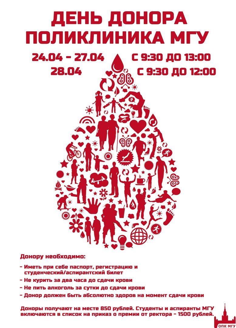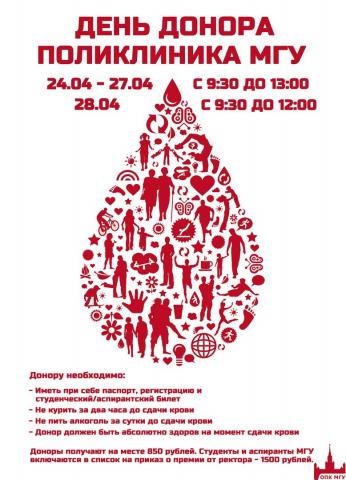 С 24 по 28 апреля 2017 года в поликлинике МНОЦ МГУ (бывшая поликлиника № 202) пройдет День донора.