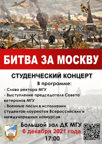 Студенческий Союз МГУ приглашает на торжественный концерт, посвященный 80-й годовщине контрнаступления советских войск под Москвой, который состоится 6 декабря в 17.00 в Большом зале ДК МГУ (Главное здание МГУ).