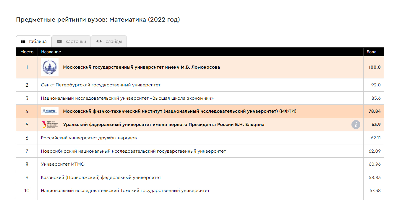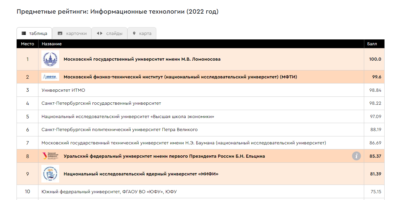 В частности, максимальный результат (100 баллов и 1 место!!!) МГУ показал в областях информационных технологий и математики.