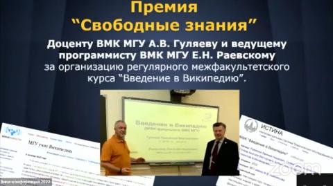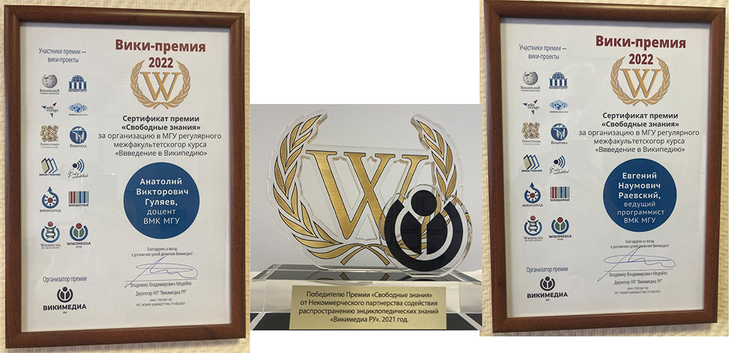 На состоявшейся 24-25 сентября 2022 года в Санкт-Петербурге ежегодной международной Вики-конференции была вручена Премия «Свободные знания» сотрудникам факультета ВМК Московского университета Анатолию Викторовичу Гуляеву и Евгению Наумовичу Раевскому.