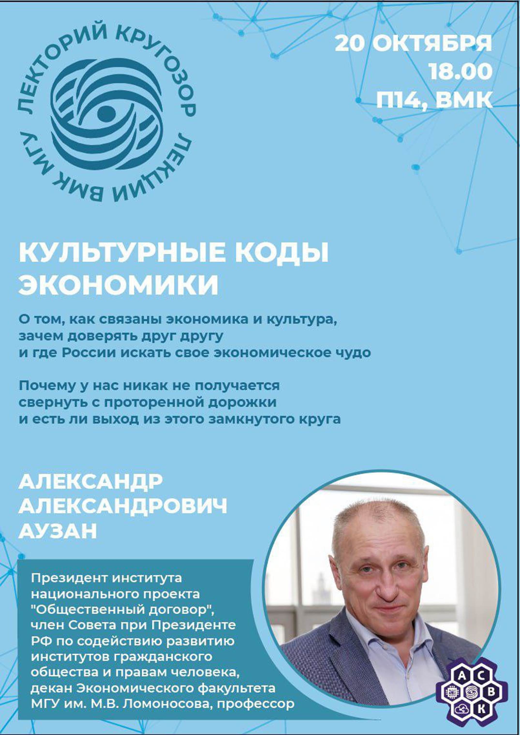 20 октября в 18-00 на факультете ВМК в аудитории П14 состоится лекция декана Экономического факультета Александра Александровича Аузана.