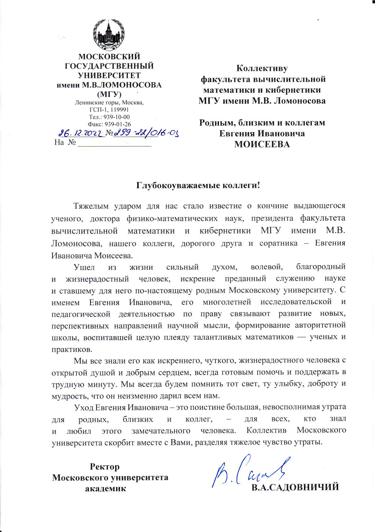 Деканат факультета ВМК с глубоким прискорбием сообщает, что ушел из жизни выдающийся ученый, президент факультета ВМК академик Евгений Иванович МОИСЕЕВ.