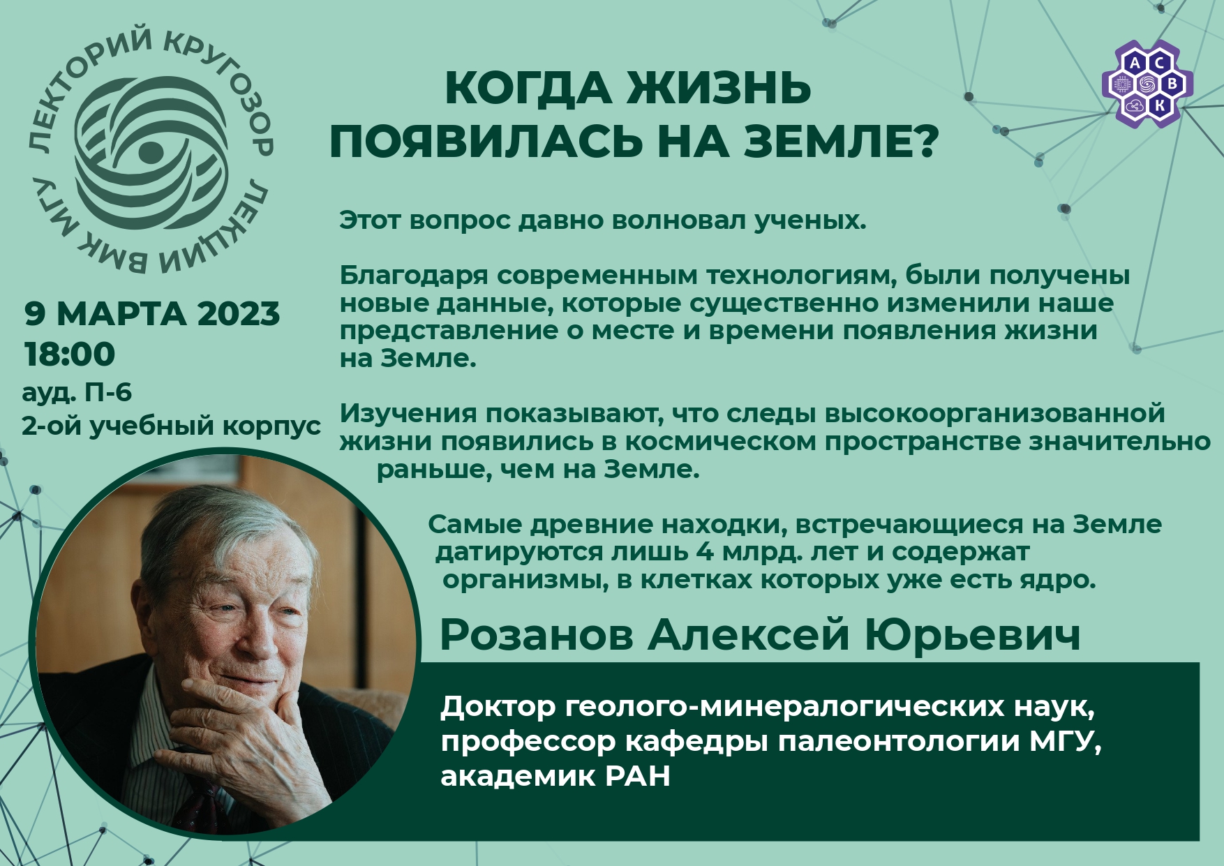 Лекция «Когда жизнь появилась на Земле?» состоится 9 марта 2023 г. в 18:00 в ауд. П-6 во втором учебном корпусе.
