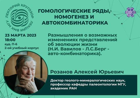 Лекция «Гомологические ряды, гомогеноез и автокомбинаторика» состоится 23 марта 2023 г. в 18:00 в ауд. П-6 во втором учебном корпусе.