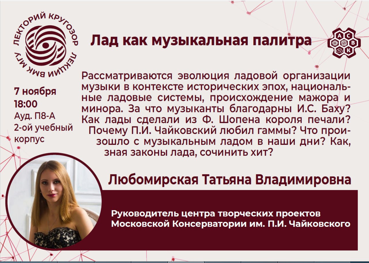 Лекция «Лад как музыкальная палитра» состоится 7 ноября 2024 г. в 18:00 в ауд. П8-А во втором учебном корпусе.