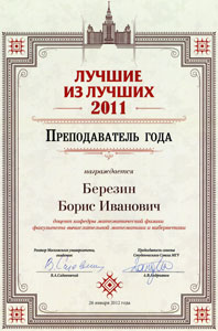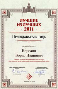Лучшим преподавателем года был признан заместитель декана нашего факультета Борис Иванович Березин, известный на весь Университет своими уникальными педагогическими способностями, а также широкой поддержкой студенческих инициатив. Вместе со словами благодарности лауреат выразил свою преданность МГУ и призвал молодое поколение к трудолюбию и целеустремленности, выбору хороших учителей, что, по его мнению, составляет золотую формулу успеха.