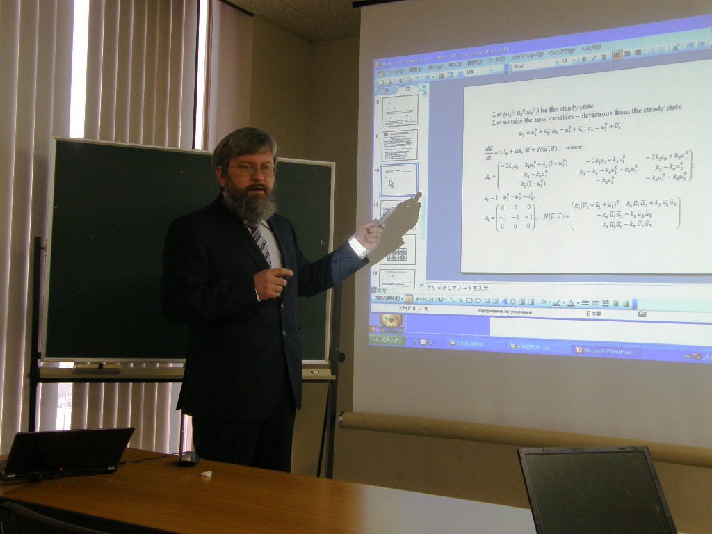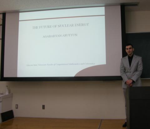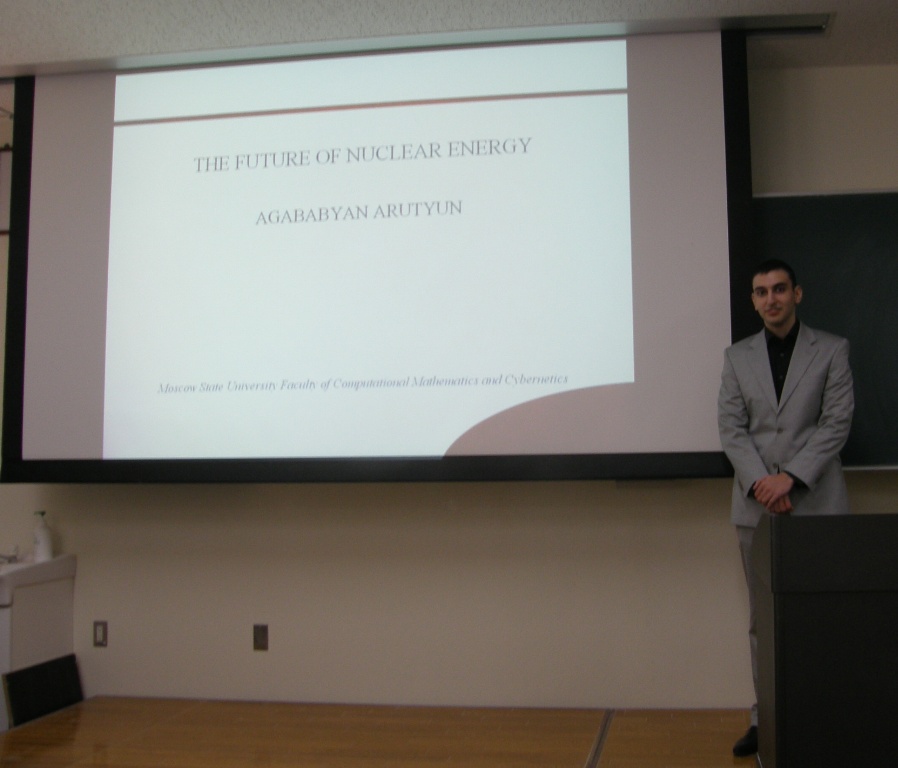 Lomonosov Moscow State University was represented at MTE 2012 by the 3-rd year students Anna Tyumeneva and Arutyun Agababyan (Faculty of Computational Mathematics and Cybernetics, Department of Operations Research; scientific advisor – Professor Alexander Vasin) and the 5-th year student Dmitry Maximov (Faculty of Physics, Department of Solid State Problems; scientific advisor – Research Fellow Andrey Shobukhov). They presented the reports: