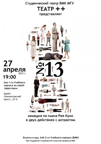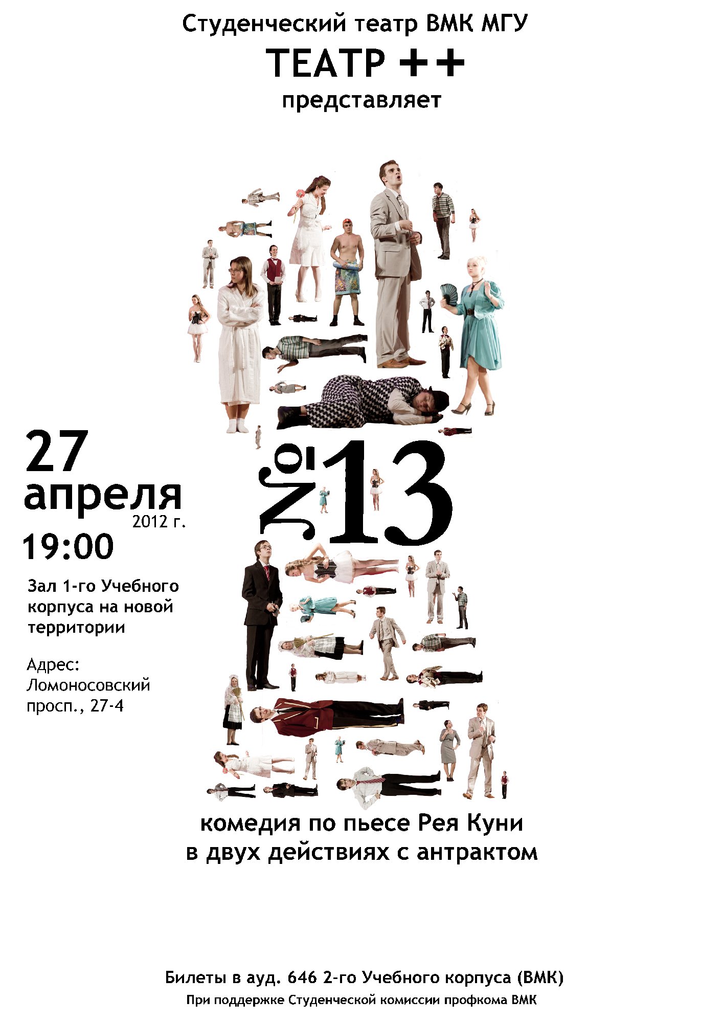 Комедию «Номер 13» по пьесе Рэя Куни представит Студенческий театр ВМК МГУ «Театр++» в пятницу (27 апреля) в 19:00 в зале Первого учебного корпуса МГУ (Ломоносовский проспект, дом 27, строение 4).