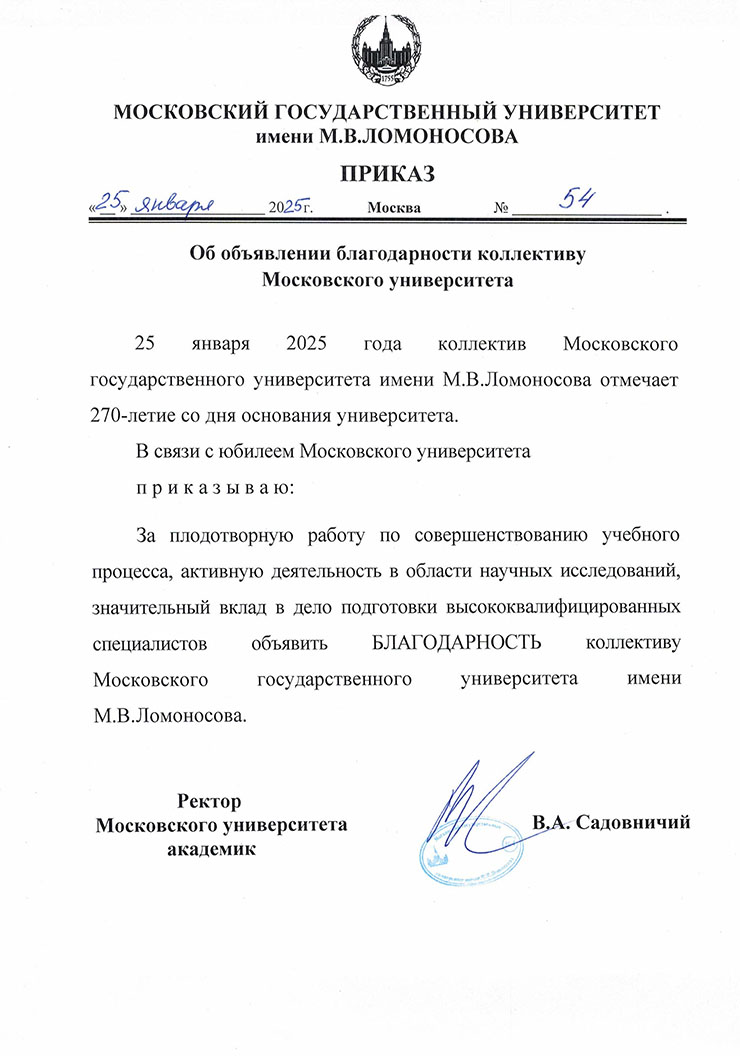 Ректор Московского университета академик В.А. Садовничий в честь 270-летия МГУ объявил коллективу университета БЛАГОДАРНОСТЬ за плодотворную работу по совершенствованию учебного процесса, активную деятельность в области научных исследований, значительный вклад в дело подготовки высококвалифицированных специалистов.